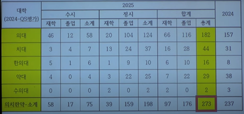 메디컬 합격자 증가(특히 의대). 연도별 의대 합격 상승 추세 지속 언급(중복 합격 포함). 2026 대입 변수: 의대 증원 축소, 수험생 증가 등. |