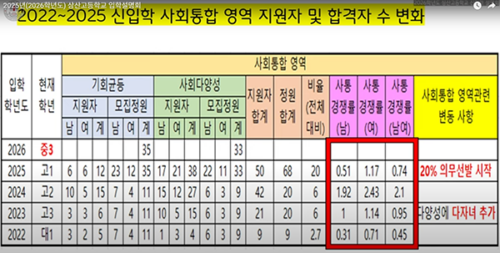 다자녀 전형 추가(‘23)→‘24 경쟁률 급증→‘25 의무선발로 정원 확대·경쟁률 하락. 자격 해당 시 사회통합 지원 유리. |