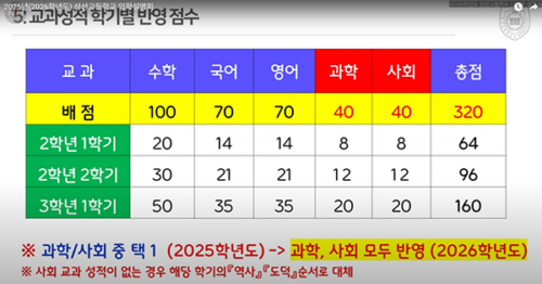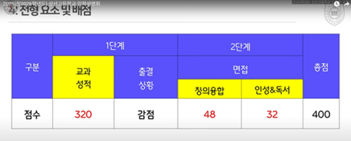 교과 320점(↑, 전년 300), 면접 80점(창의 48·인성독서 32, 전년 100에서 ↓). 실반영은 400점 만점 중 40점으로 전년과 동일. 사회·과학 모두 반영(각 40→합 80으로 확대). |