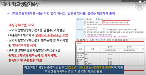 자사고용 생기부 열람: 성취도(A~D)만 확인, 3학년 1학기 성적 점수화 (2학기 활동·성적은 면접관 열람 가능). |