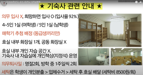 의무 아님, 전체 입사율 약 92%. 여: 1학년 5인실→2·3학년 4인실, 남: 3년 5인실. 학기별 추첨으로 룸메이트 변경·갈등 고려. 세탁 외주, 실내 화장실(여는 공용 추가). |