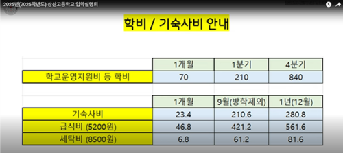 교육비 월 약 70만(연 840만), 기숙사 월 약 23.4만(연 281만), 급식비 일 5,200원 기준 연 약 560만(인상 가능). 일반고 대비 총비용 단순 비교 지양(사교육·식비 변수). |
