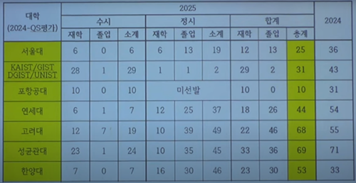 2024 주요대 인원 감소는 의·메디컬 선호 이동 영향. 재학생은 수시 강세, 졸업생은 정시 강세이나 실제 합격 비율은 양측 모두 존재 |