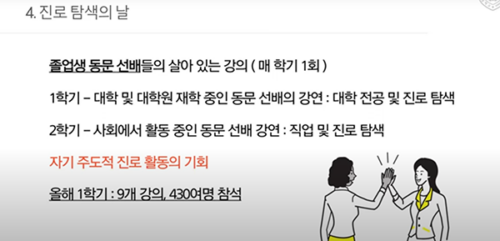 다양한 분야 동문 특강으로 진로 탐색·조언. 자사고 강점인 동문 네트워크 체감. |