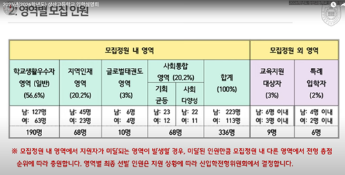 총 12학급(남 8, 여 4) 336명. 영역별 인원 전년 동일. 사회통합·지역인재 20% 이상 의무 선발, 사회통합 미달 시 일부 학교생활우수자 충원(작년 사례 설명). |