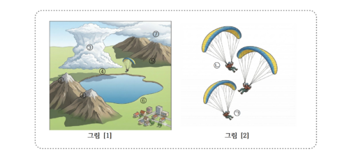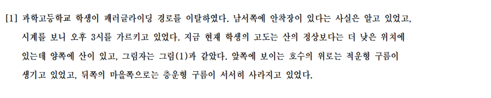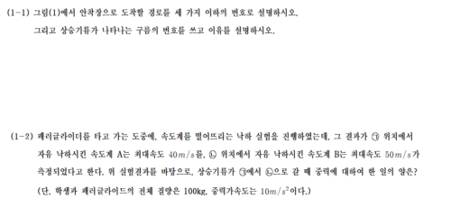 물리 기반의 기류 문제(패러글라이딩)를 통해 관찰, 방향성 추론, 그리고 에너지 개념(일의 계산)까지 평가.